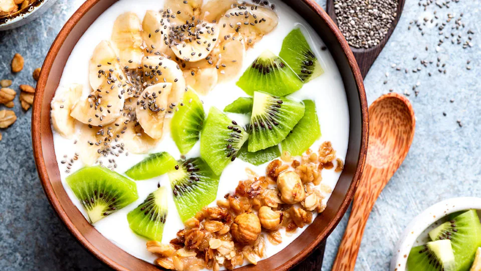 Yogur griego, granola casera y kiwi