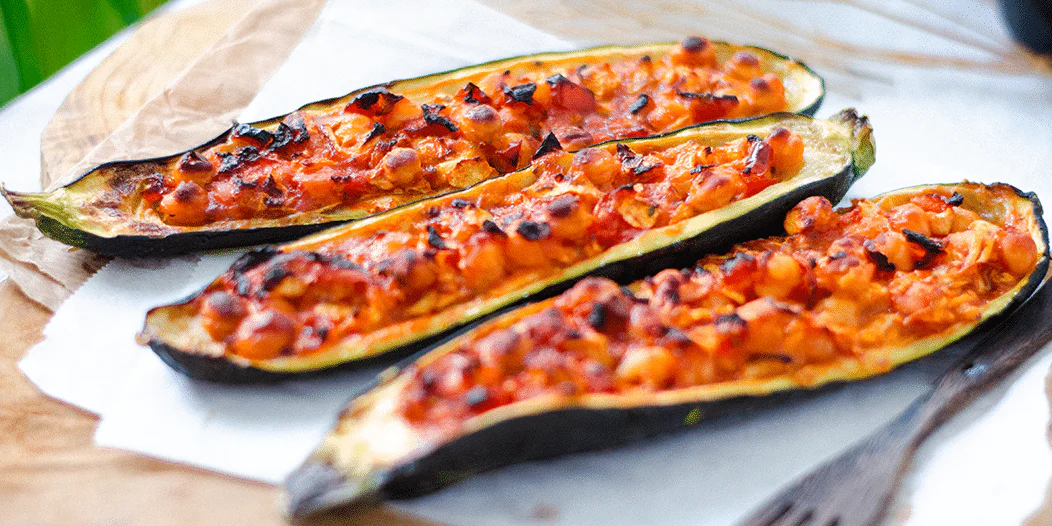 - Berenjenas rellenas de soja texturizada: berenjenas asadas y rellenas con soja texturizada hidratada y salsa de tomate casera.