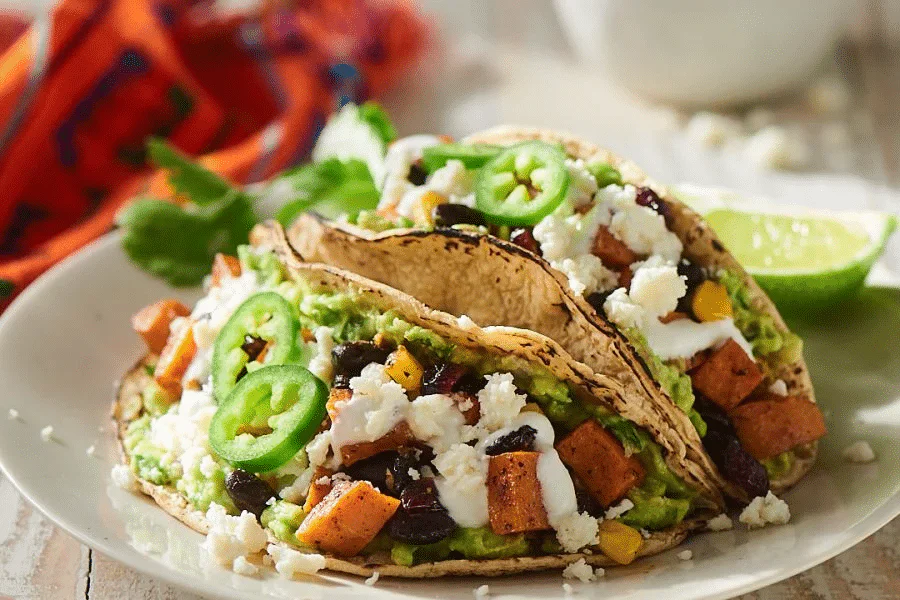 - Tacos vegetarianos de frijoles: tortillas integrales, frijoles cocidos, lechuga, tomate y aguacate.